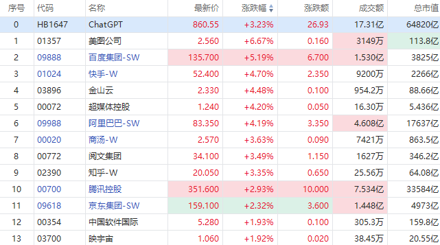 3月15日,港股ChatGPT概念股走强。截至发稿,美图公司涨6.67%,报2.56港元每股;百度集团-SW涨5.19%报135.7港元每股,成交额1.53亿港元;快手、金山云、超媒体控股涨超4%,阿里巴巴涨4.19%,商汤、阅文集团、知乎涨超3%,腾讯涨2.93%。点击查看概念股详情>>