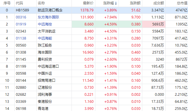 3月15日,港股航运股大涨。截至发稿,东方海外国际涨7.94%报131.9港元每股,中远海控涨4.59%,太平洋航运涨4.5%,中远海能涨超3%报8.75港元每股,海丰国际涨超2%,中国外运、招商局港口跟涨。