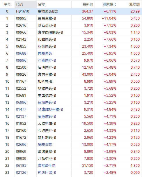 其他生物医药B类股方面,荣昌生物-B涨超11%,基石药业-B涨超7%,再鼎医药、康方生物-B涨超6%,腾盛博药-B、欧康维视生物-B、歌礼制药-B等涨超4%,诺诚健华-B、开拓药业-B涨超3%,康希诺生物、药明巨诺-B涨超2%。