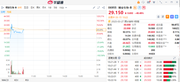 华盛资讯3月15日讯,港股医药股早盘强势拉升,截至发稿,博安生物-B涨超49%,报29.15港元。值得关注的是,博安生物-B昨日收涨32.11%,两日累计涨幅超97%。