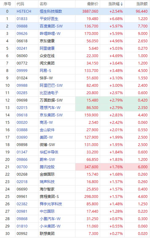 科网股集体走高,哔哩哔哩-W、百度集团-SW涨近6%,网易-W涨超3%,阿里巴巴-SW涨3%,京东集团-SW涨超2%,美团-W、腾讯控股涨近2%
