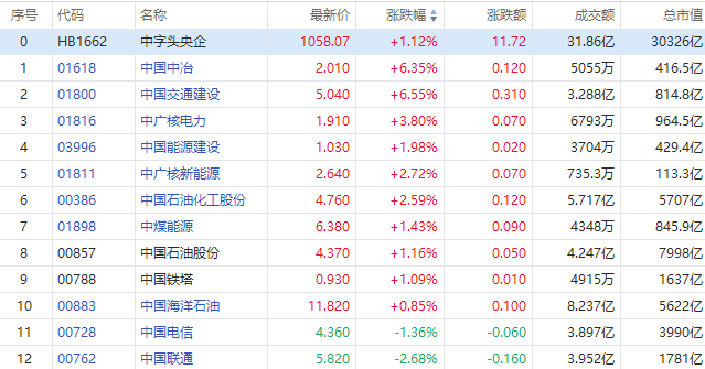 3月15日消息,港股中字头央企概念午后多数走高。截至发稿,其中基建央企强势,中国交通建设涨6.55%报5.04港元每股,成交额3.28亿港元;中国中冶涨6.35%,中广核电力涨3.8%,中国石油化工股份涨2.59%报4.76港元每股,成交额5.71亿港元;中国能源建设、中国海洋石油跟涨。盘面上,中国电信跌1.36%,中国联通跌跌超2%。