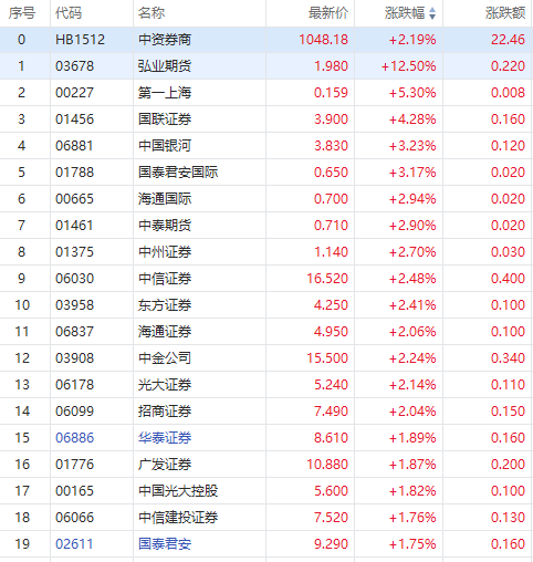港股券商板块普遍造好,截至发稿,弘业期货涨超12%,国联证券涨超4%,国泰君安国际涨超3%,海通国际、中州证券、中信证券、东方证券、海通证券、中金公司等涨超2%,广发证券、华泰证券等涨超1%。