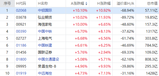 截至发稿,中铝国际A股涨停,H股现涨10.92%,弘业期货A股涨停,H股现涨11.93%,中国中铁A股涨6.7%,H股现涨8.13%。