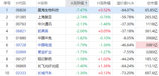 昊海生物科技A股跌7.47%,H股现涨0.52%,上海复旦A股跌2.74%,H股现跌0.76%,中国电信A股跌1.79%,H股现跌1.36%。