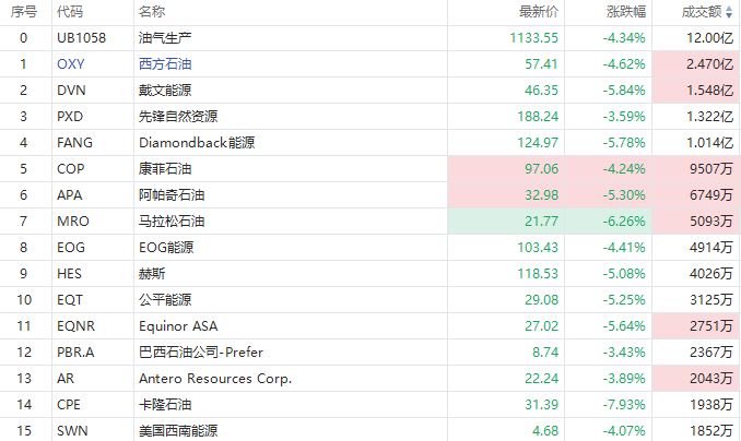 截至发稿,马拉松石油跌超6%,戴文能源跌超5%,阿帕奇石油跌超5%,康菲石油跌超4%,西方石油跌超4%,先锋自然资源跌超3%。