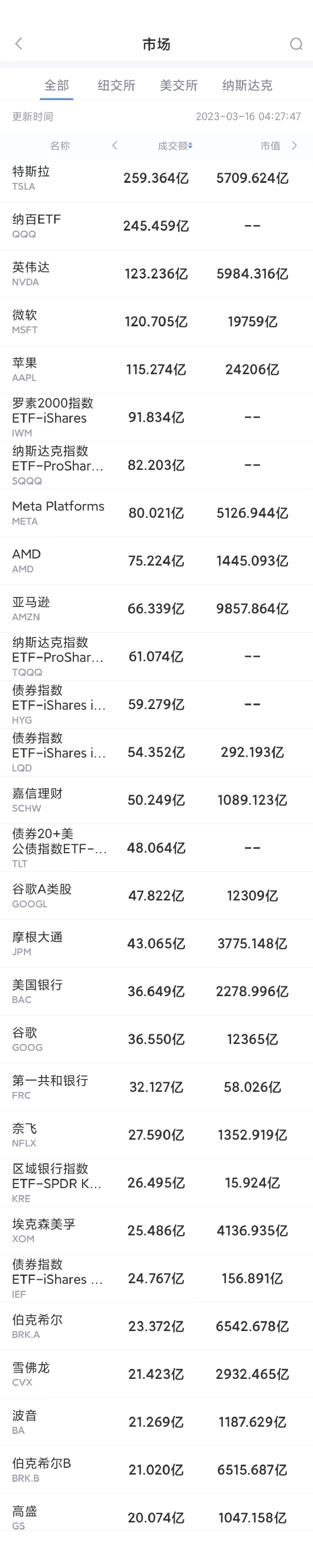 第8名嘉信理财收高5.06%,成交50.2亿美元。3月13日,创始人Charles Schwab和首席执行官Walt Bettinger发布联名信,强调其资本金远远超过监管要求,贷款规模相对较小,投资组合保守,并透露“超过80%的客户现金都得到了联邦存款保险公司的全额担保”,在美国前100家银行中是最高的。