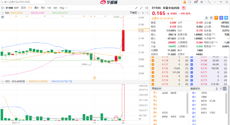 引入海外股东及债务重组等事件披露后,华夏文化科技(01566)大幅高开。截至发稿,华夏文化科技涨101.22%,报0.165港元,市值1.95亿港元。