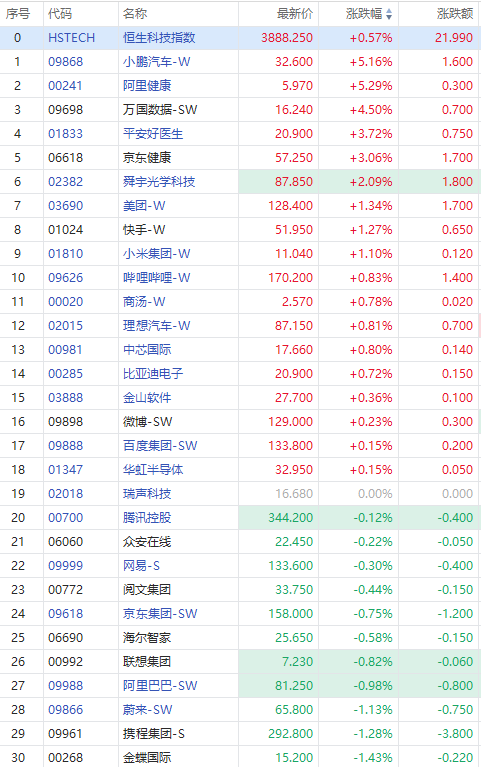 其他成分股方面,舜宇光学科技涨超2%,商汤-W、中芯国际涨近1%;金蝶国际、携程集团-S跌超1%。