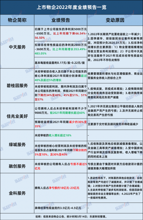 3月13日晚间,金科服务发布2022年度业绩预告。而在不久前,融创服务和佳兆业美好等也已经披露,截至目前已有6家物企公布业绩走向。
