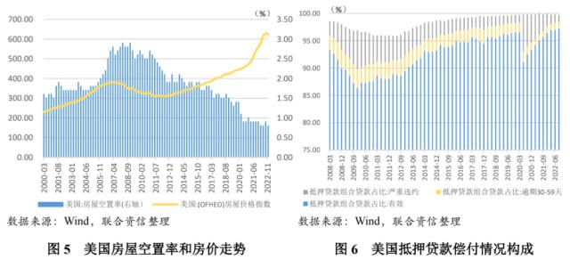 与2008年雷曼破产以及美国房价全面下跌的程度不同,二者均不具备大范围的冲击影响,预计二者的风险仍然会在小范围内传播,但暂时不会引发类似于2008年雷曼危机时的系统性金融危机。从美国房地产市场看,虽然美国的OFHEO房屋价格指数在2022年12月环比下跌了0.78%,但整体美国OFHEO房屋价格指数依旧高居623.7,处于1975年有数据统计以来的最高值,整体美国地产价格仍较为稳健。同时,美国的地产市场并未发生类似于2008年次贷危机时期的空置率大幅攀升以及次级抵押贷款大量违约的情况,截止2022年12月,美国的房屋空置率仅为0.8%,处于1956年有数据统计以来的较低水平。截止2022年9月末,美国抵押贷款组合中有效贷款占比高达97.2%,远超次贷危机时期最低的86.5%;逾期30~59天的贷款占比仅为1.2%,远低于次贷危机时期最高的3.5%;严重违约的贷款占比仅为1.3%,远低于次贷危机时期最高的7.1%和新冠疫情暴发后的6.8%,整体看美国房地产市场依旧较为健康。