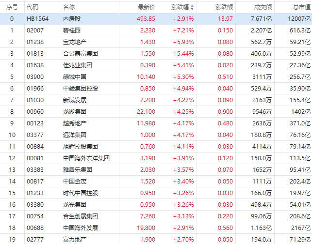 3月17日,内房股早盘集体走高,截至发稿,碧桂园(02007)涨7.21%,报2.23港元每股,成交额2.21亿港元;宝龙地产(01238)涨5.93%,合景泰富集团(01813)涨5.44%;佳兆业集团、绿城中国涨超5%,越秀地产、龙湖地产、旭辉集团控股升逾4%,龙光集团涨3.26%,中国海外发展、富力地产跟涨。