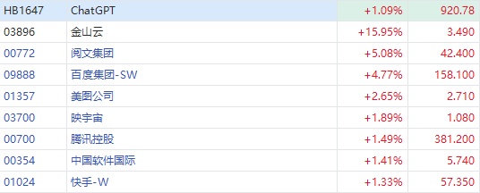 港股ChatGPT概念股再获热捧,金山云 $03896.HK 狂飙16%,联想集团涨超10%,阅文集团涨超5%,百度集团涨超4%,知乎升逾3%,美图公司、腾讯控股、网易-S等跟涨。