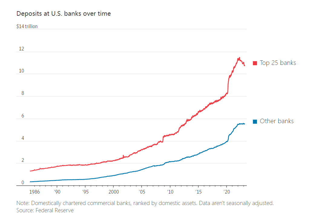 美国银行的存款量:大型银行(红)、其他银行(蓝)