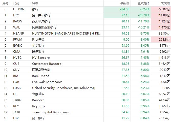 截至发稿,第一共和银行跌超20%,西太平洋银行跌超11%,阿莱恩斯西部银行跌超10%,瑞士信贷跌超5%;大型银行股普跌、汇丰控股、花旗集团、富国银行跌超4%;美国银行跌超4%。