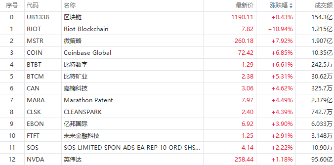 区块链概念异动走高,Riot Blockchain涨超10%,微策略涨超8%,Coinbase Global,比特数字涨超6%,比特矿业涨超5%,嘉楠科技涨超4%,亿邦国际涨超3%,英伟达涨超1%。