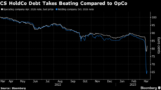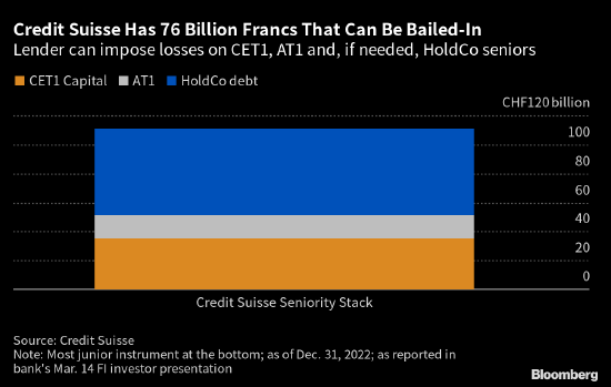 瑞信旗下控股公司的近760亿瑞郎(820亿美元)内部纾困债券和额外一级资本(AT1)债券目前已跌至反映公司陷入困境的水平。如果监管机构出手保护瑞信储户,AT1债券将被注销,而优先内部纾困债券将被转为股本。如果瑞信的资本充足率低于预定水平,也可以减记AT1。