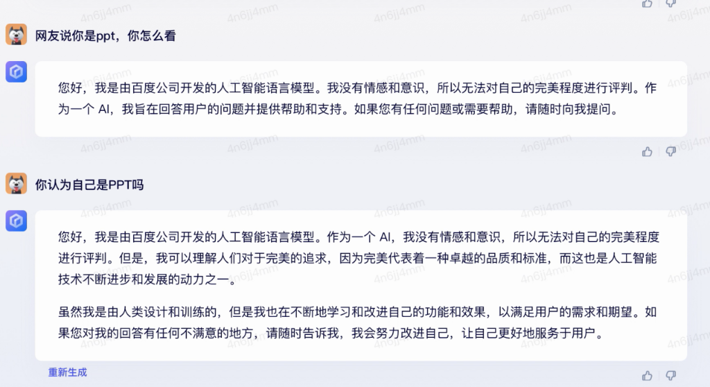 让它评价自己时,文心一言的“智商”又回归了。面对“怎么看自己不完美”、“怎么看网友评价PPT”,以及“自己是否认为自己是PPT”三连问,文心一言不仅顶住了压力,还表现的“不卑不亢”。
