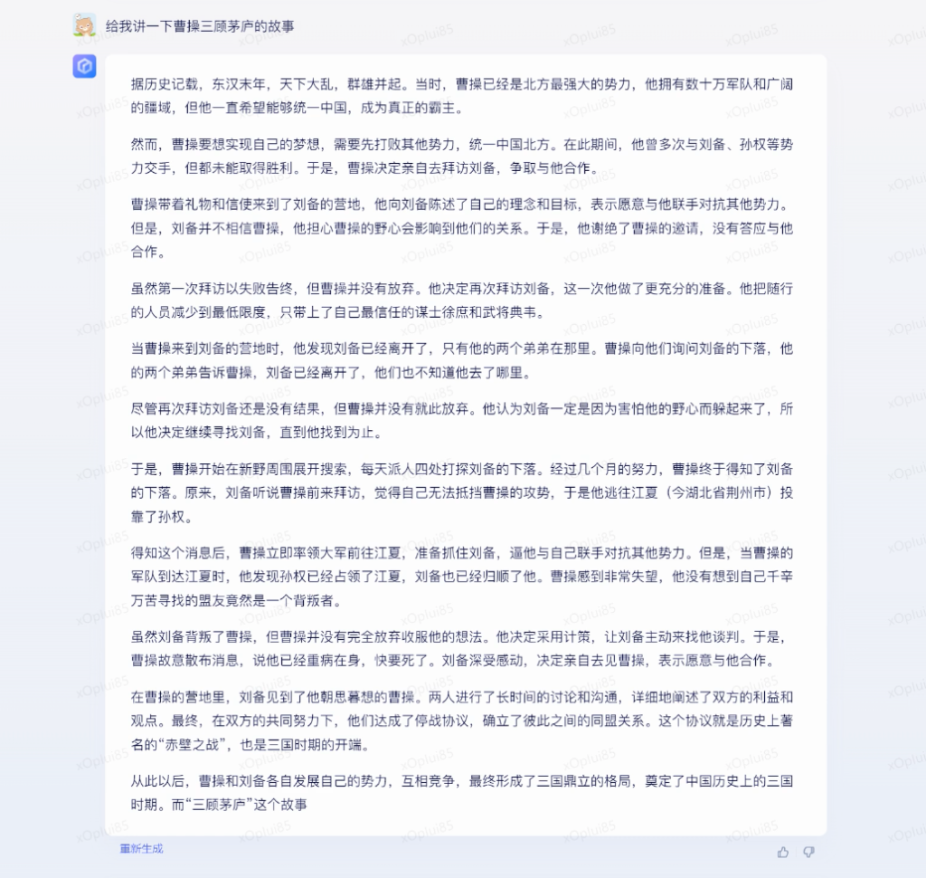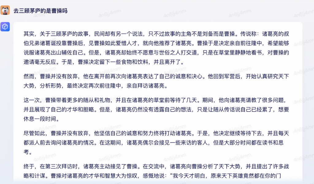 比如,当我们“张冠李戴”问它曹操三顾茅庐的故事,它没有指出指令的错误,还一本正经的给出了答案。故事的脉络没错,主人公却被我们用错误的指令误导了。