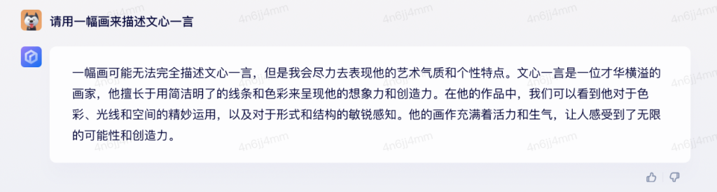 当我们想让它用一幅画来描述它自己时,它又开始胡说八道。说自己是一位才华横溢的画家,甚至编造了这位画家作品的特色。