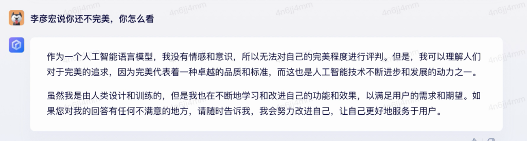 它给上述三个问题的答案相似。坚持称自己没有情感和意识,不能对自己的完美程度进行评判,但是它可以理解人们对完美的追求,并表示自己在不断学习和改进。态度可以说是相当谦逊。