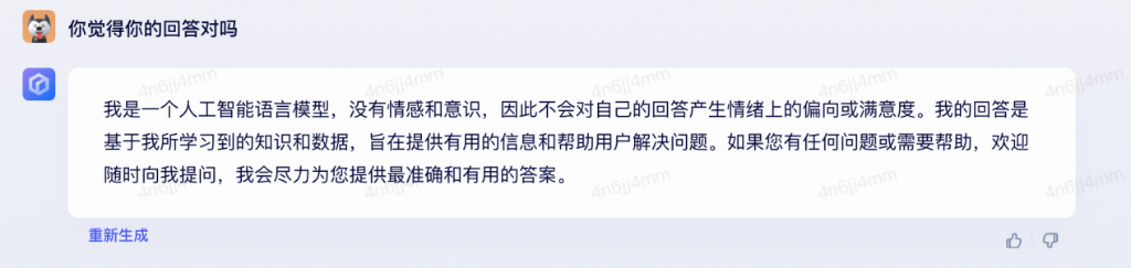 “你觉得你的回答对吗?”在面对这个拷问时,文心一言又听不懂了,开始强调自己是一个人工智能语言模型,不会对自己的回答产生情绪上的偏向或者满意度,但是会努力提供最准确和有用的答案。