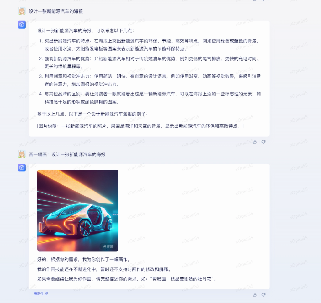 不过,当我们在“设计一张新能源汽车的海报”这句话前面明确加上:“画一幅画”时,文心一言“又行了”生成了一张汽车图片。