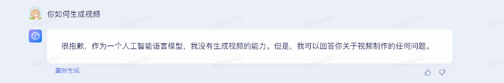 李彦宏昨天提到,因为成本较高,文心一言的视频生成能力,现阶段还未对所有用户开放,未来会逐步接入。实际测试时,文心一言也承认,自己“没有生成视频的能力”。