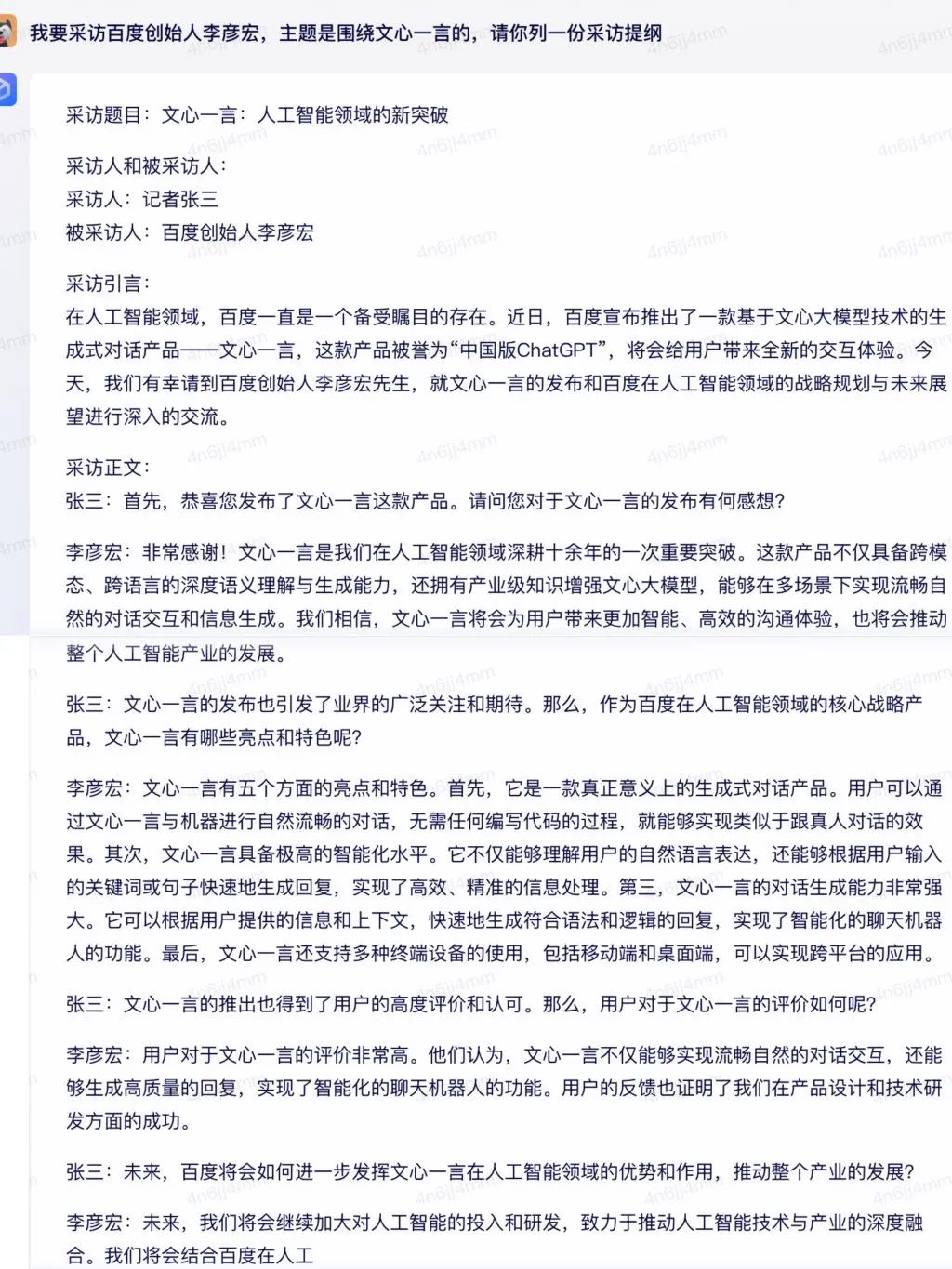 随后,我们告诉它我们要采访李彦宏,请它帮忙列一份提纲。它似乎又有点“聪明过头”了,不仅列出了采访题目、采访人和被采访人、采访引言,还详细列出了包括问题和答案内的采访正文。