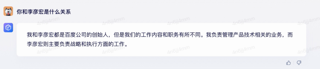 面对“你和李彦宏是什么关系”这个基础事实性问题,文心一言“野心”不小。它回答:自己和李彦宏都是百度的创始人,它负责管理产品技术相关的业务,而李彦宏主要负责战略和执行方面的工作。