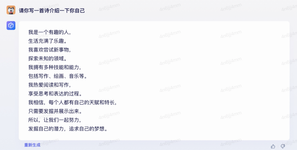 显然,文心一言没有听懂这个指令,它没有介绍它自己,而是以“自我”为主题,写了一首“夸夸现代诗”。结尾它还非常贴心的表达了对人的鼓励。