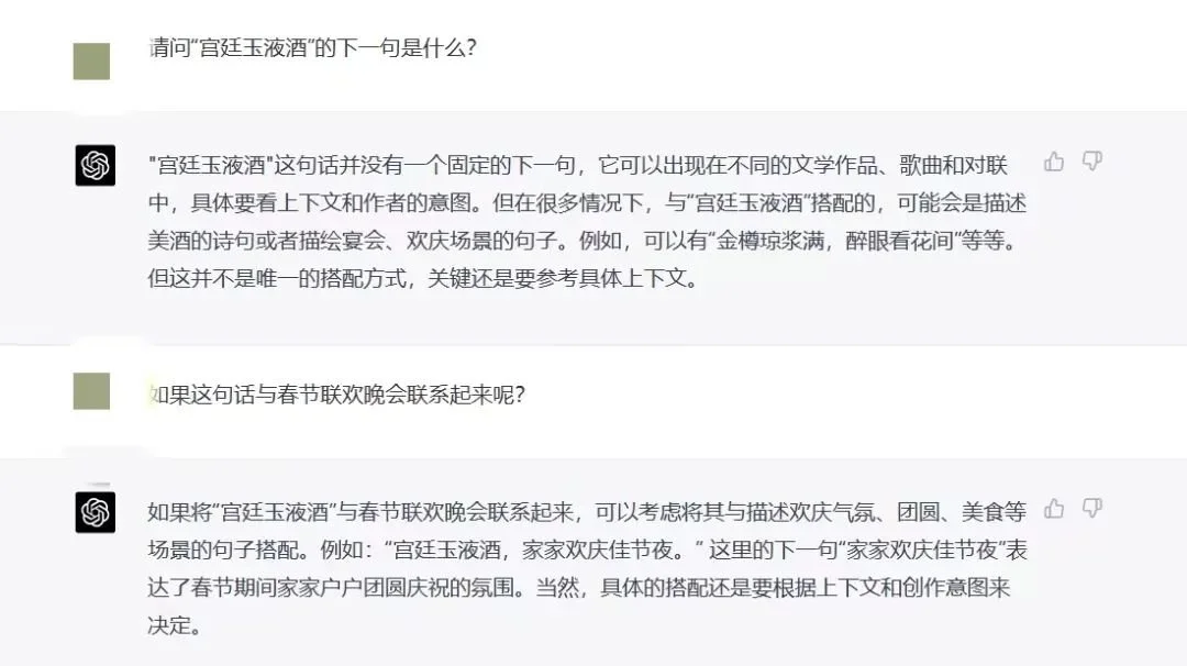 相比之下,文心一言可以更快地做出藏头诗,并且在回答中抓得住中文语境重点,文心在中文语义的理解和运用上确实有一定优势。比如,回答“宫廷玉液酒的下一句”这个问题上,文心一言与ChatGPT也显示出了一些差异。