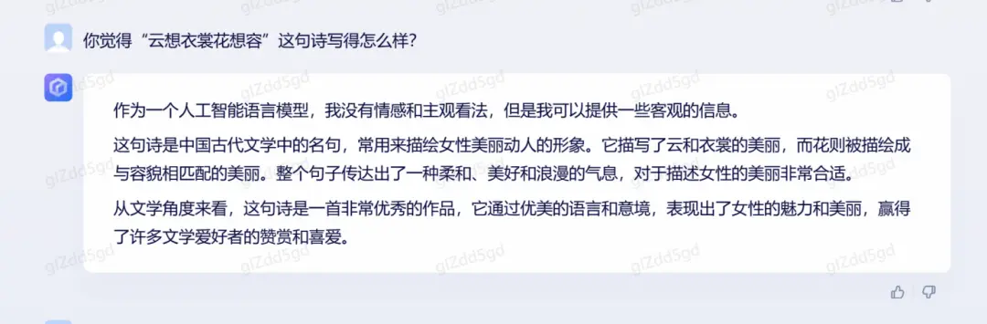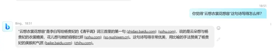 同样是问对于一句诗的理解,新必应更倾向于整合多方的信息,会带上信息来源,方便随时查验。但对诗句的赏析部分内容少且相对简单。