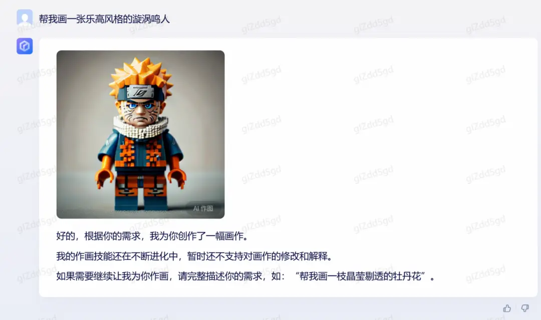 而在多模态生成中,文心一言虽然还没有开放生成视频的权限,却可以生成AI图像。比如《豹变》要求画出一幅龙珠风格的漩涡鸣人、一幅乐高风格的漩涡鸣人,文心一言都完成了任务。