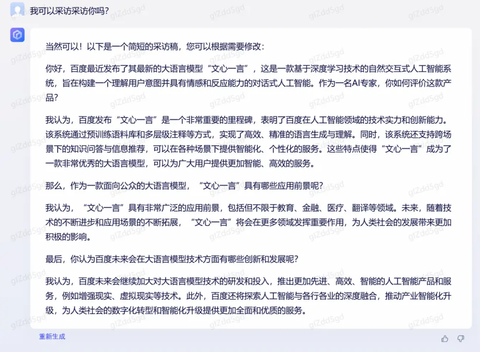 为了一探文心一言成色如何,《豹变》特地采访了本次舆论中心的文心一言本人工智能。文心一言不但大方接受了采访,还代《豹变》拟好了简短的采访稿,老实不客气的从三个方面夸奖了自己。在余下的稿件中,也贡献了不少专业AI的看法。