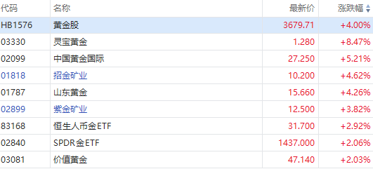 金价强势运行,港股黄金股持续走高,截至发稿,灵宝黄金涨超8%,中国黄金国际涨超5%,招金矿业、山东黄金涨超4%,紫金矿业涨超3%,价值黄金跟涨。