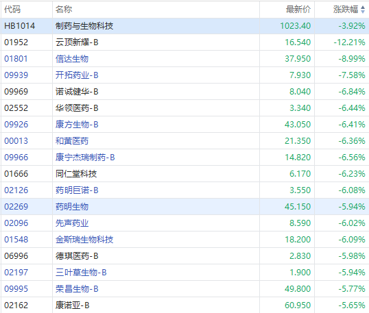 3月20日消息,港股生物医药股跌幅扩大,云顶新耀-B跌超12%,信达生物、诺辉健康跌超8%,开拓药业-B跌超7%,诺诚健华-B、药明巨诺-B跌超6%,三叶草生物跌近6%,再鼎医药、康希诺生物跌约5%。
