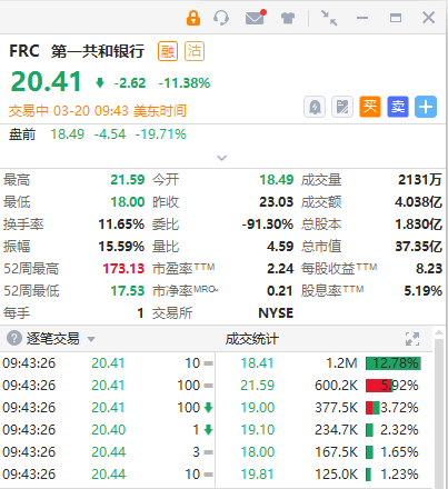 盘面上,第一共和银行于盘中停牌,现跌幅收窄至12%以内,此前公司评级遭标普一周内二次下调。瑞信跌超48%,瑞银涨近8%;瑞银以全股票方式收购瑞信;大型银行股方面,花旗银行、美国银行跟涨。