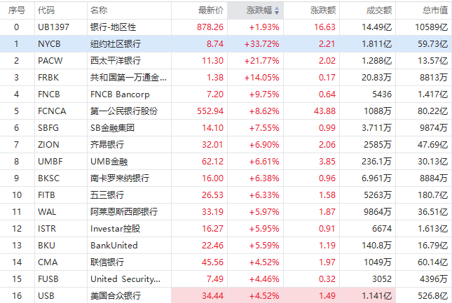 截至发稿,区域银行股普遍反弹,纽约社区银行猛涨33.72%报8.74美元每股,西太平洋合众银行涨21.77%,阿莱恩斯西部银行涨近6%,美国合众银行涨超4%.