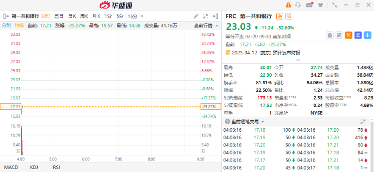 第一共和银行盘前跌超24%。在评级被标普全球下调至垃圾级数天后,第一共和银行当地时间周日再次被该评级机构降级。标普宣布,将该行的长期发行人信用评级从BB+下调至B+。标普上周三将第一共和银行评级降至垃圾级,即从A-下调至BB+。