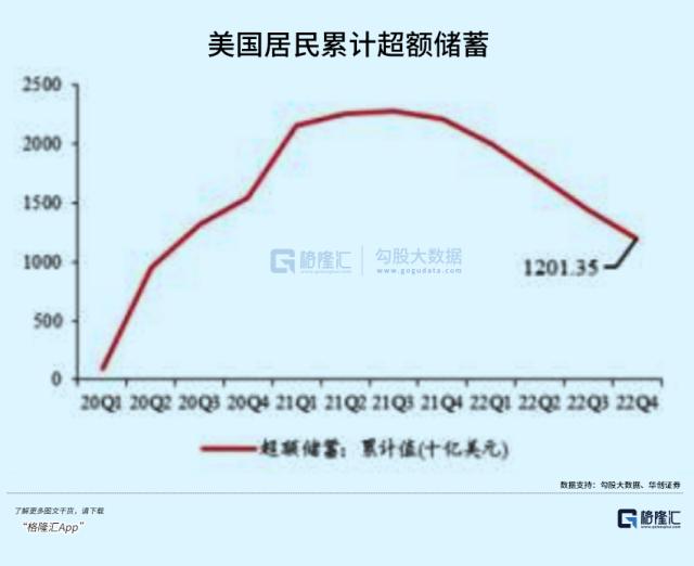 从2020年Q4至2022年Q4,超额储蓄已经减少1.1万亿美元,剩下1.2万亿美元。超额储蓄持续消耗,并没有流向股市与楼市,更多是流向消费领域,支撑了美国经济的韧性增长。