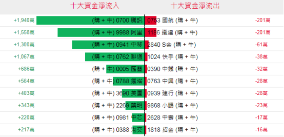 好仓(认购证及牛证)方面,周一腾讯控股、阿里巴巴、中国移动、中国联通等相关好仓分别约1940万、1558万、1300万及1067万港元资金净流入部署; 国航、铁建等相关好仓则见资金净流出套现。