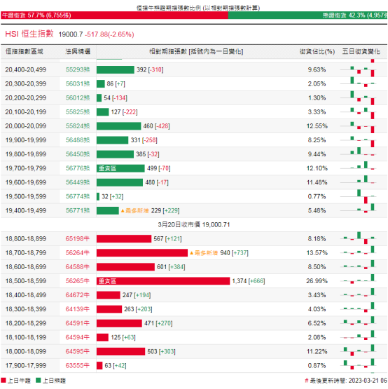 街货分布方面,至周一,恒指牛证街货集中在收回价18500点至18900点之间,累计相当约3482张期指合约; 恒指熊证街货在收回价19400点至20100点之间,合计相当约2416张期指合约。