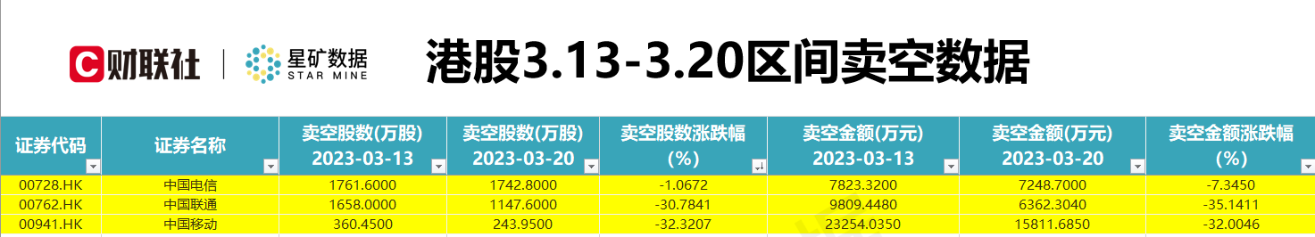 包括中国电信、中国移动、中国联通在内的三大运营商的卖空股数及金额重回高位,仅次于3月13日的峰值。