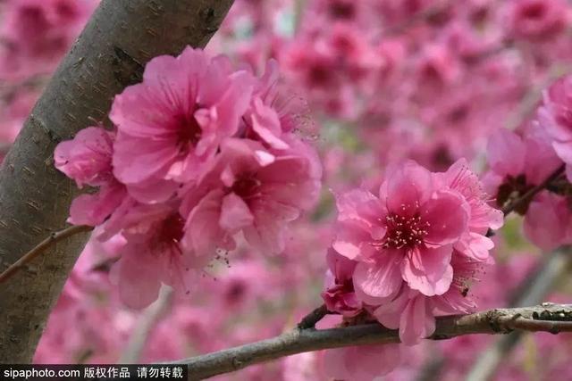 路旁桃花密密地绽开在枝头,一棵棵桃树宛若被粉色彩云萦绕。