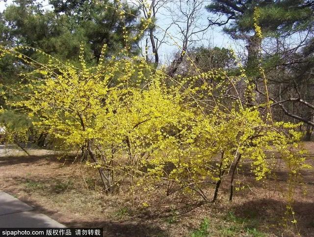 迎春花:香山迎春花较市内开放略晚,主要集中在南北主干道勤政殿、致远斋、昭庙等古建周围,在湖边林缘也有一些种植,黄灿灿的小花与红墙绿瓦、与假山叠石相映成趣,带来盎然的生机。