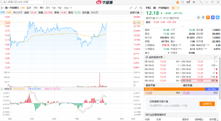 截至20:15,第一共和银行盘前反弹涨超25%,昨日该银行暴跌近50%,报道称摩根大通正在为陷入困境的第一共和银行(FRC.US)提供解决方案,这些方案可能包括增资,这或许会稀释目前该行股东手上的股份,出售也是一种可能性。