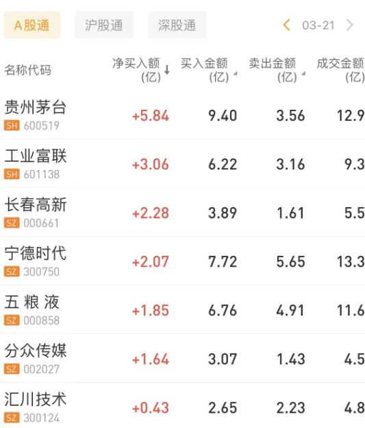 北向资金今日净买入42.95亿元。贵州茅台、工业富联、长春高新分别获净买入5.84亿元、3.06亿元、2.28亿元。山西汾酒净卖出额居首,金额为2.63亿元。