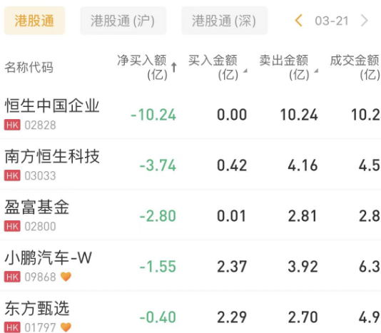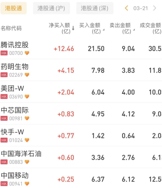 南下资金今日净买入港股10.13亿港元。腾讯控股、药明生物、美团-W分别获净买入12.46亿港元、4.15亿港元、2.04亿港元;恒生中国企业净卖出额居首,金额为10.24亿港元。注:南下资金自3月6日迄今已连续12个交易日净买入腾讯,累计约82.08亿港元。