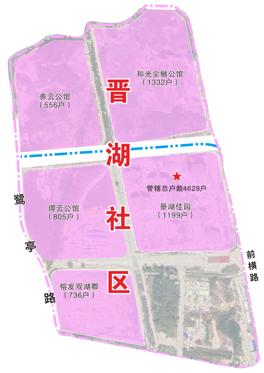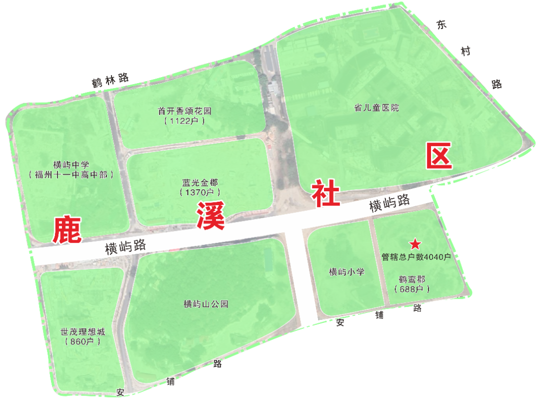 社区四至范围:东至前横路、南至化工路,西至鹭亭路,北至鹤林路。